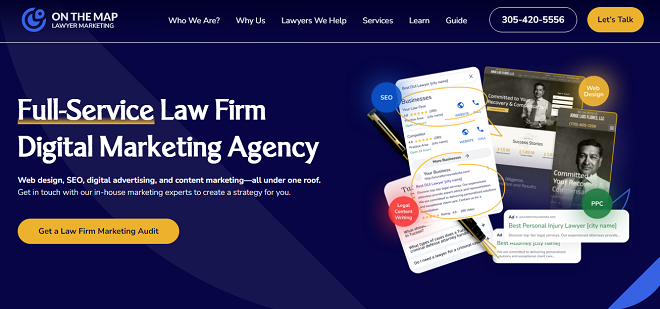 A dominant force in the Miami market, On The Map is famous for its aggressive SEO and ROI-focused digital campaigns. They specialize in helping personal injury and criminal defense firms dominate page-one rankings in highly competitive urban centers. Their team utilizes proprietary link-building techniques and rigorous technical audits to ensure maximum visibility. With a transparent, performance-based culture, they provide law firms with real-time dashboards to monitor keyword progress and lead generation metrics.