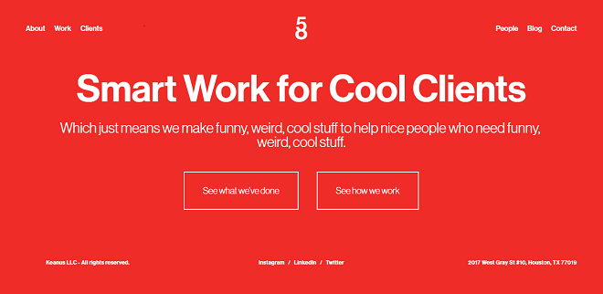 Location: Houston Avg. Hourly Rate: $150 - $199 / hr Contact:adam@5plus8.com / +1 832 203 8598 Focus: 40% Branding, 25% Marketing Strategy, 15% Social Media Marketing, 10% Advertising, 10% Web Design