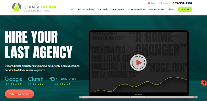 Headquarters: Chicago, IL Avg. Hourly Rate: $100 - $149 / hr Contact: info@straightnorth.com / +1 855 496 7838 Focus: 70% Search Engine Optimization, 25% Pay Per Click, 5% Web Design